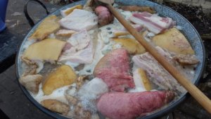 Természetesen disznótoros reggeli. Abált (kövesztett) szalonna is volt, ami szintén az abalében főtt.