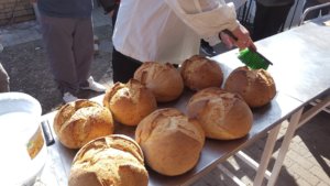A toros vacsoránál már nem nagyon voltunk éhesek, pedig volt ott minden. Hideg ételek, sültek, kolbász, hurka, savanyúságok, sütemény. Itt vágták fel azt a nagy cipót is, ami töltésre került és mintegy hat órán át kuksolt a kemencében.