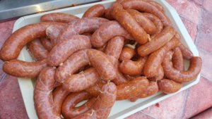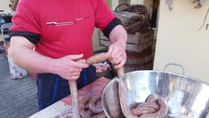 Ebéd után siettem ki, hogy le ne maradjak a disznósajt és a hurkák töltéséről. Kissé elkéstem, mert már az abalében főtt a disznósajt és a böllérfiú a májas hurka töltéséhez készülődött. Beszédbe elegyedtem vele és rákérdeztem kedvencemre, a véres hurkára is. Ennek semmi nyomát nem láttam.