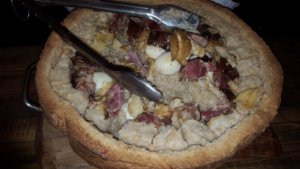 Egy jó nagy tésztatömeget megpakolt mindenféle jóval (főtt tojás, káposzta és füstölt főtt csülök). Lezárta egy másik tésztadarabbal és a kisebb cipókkal együtt bevetette a kemencébe. A kisebb cipók kisülését követően kihoztak egy-két kencét (kacsazsír, töpörtyűs zsír, chilis zsír, fokhagymás tejföl). Itt aztán mindenki megkenhette a még meleg kenyérszeletét a zsírokkal, aztán ihatott is rá. Itt bizonyos fokú önmérsékletet kell az embernek gyakorolnia, hogy értelme legyen a közelgő ebédnek is.