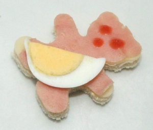 A kenyeret megpirítom és a szeletekből macikákat szúrok ki. Vékonyan megkenem vajjal. A sonkából és a trappistából ugyanígy sajtmacikákat és sonkamacikákat szúrok ki és ráteszem őket a megvajazott pirítósokra, majd mindegyiknek a tetejére fektetek egy fél karika főtt tojást. A végén egy-egy plüttynyi ketchupot nyomok rá szemek és száj gyanánt.