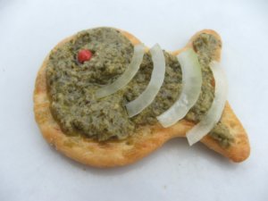 A krékereket megkenem pestoval. A hagymakarikákból íveket vágok és az ábra szerint a falatkára helyezem őket. Vörösbors szemeket halszemként teszem rá a falatkákra.
