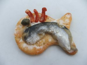 A krékereket megvajazom. A halakat lecsepegtetem, kifilézem (gerinc eltávolítása) és hosszában kettévágom. A megtisztított hagymából karikákat, azokból pedig kicsi íveket vágok, melyeket fűszerpaprikába hempergetek. A kanapékra ráhelyezem a ruszlikat és hagymaívekkel dekorálom. “Halszemként” egy-egy kapribogyót használok.