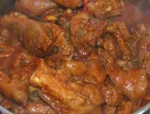 A zsírban aranysárgára pirítom az apróra vágott hagymát, majd beleteszem a leperzselt, megkapart, négyfelé vágott körmöket. Sózom, paprikázom, beleteszem a püréket és egy kevés vizet. Rászórom a köménymagot és állandóan ügyelve arra, hogy le ne égjen, félpuhára párolom (a vizet időnként pótolom). Ekkor belekarikázom a paprikát, a paradicsomot és beleteszem a zúzott fokhagymát.
