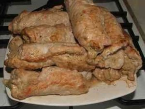 A rostélyost kicsontozom, faggyúját leszedem, vékonyan felszeletelem és kiklopfolom. A szalonnából kb 1x1x10 centis csíkokat vágok. A hússzeleteket sózom, borsozom, mindegyikbe teszek egy szalonnacsíkot, majd feltekerem és hústűvel, vagy fogvájóval megtűzöm. A kuktába teszek egy jó fakanálnyi zsírt, felhevítem és megforgatom benne a hústekercseket. Megszórom borssal, megstaubolom a liszttel és beleteszem a bort és a húslevest. Lezárom és a jelzéstől számítva bő egy óráig főzöm.