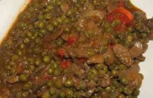 A zsírban aranysárgára pirítom az apróra vágott hagymát. Hozzáadom a fűszerpaprikát, a paradicsompürét, a finomra vágott fokhagymát, felöntöm 3 dl vízzel és enyhén sózom. Fél óráig főzöm, miközben többször megkeverem. Hozzáadom a megmosott és felszeletel gombát, 2-3 percig pirítom, utána hozzáadom a felkockázott libamájat, a lecsepegtetett zöldborsót és a zöldpaprikát is. További 3-4 percig párolom.