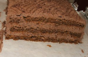8 sárgáját, 2 kanál cukrot, a kakaót és 2 kanál vizet gőz felett felforralok, lehűtöm és 30 dkg vajat keverek el benne jó habosra. - A lapból 4 hosszúkás lapot vágok, megtöltöm a krémmel, majd a maradékkal bevonom.