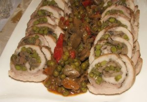 A hússzeleteket kiklopfolom és átfedéssel egy nagy lapot rakok ki belőlük. A zsírban aranysárgára pirítom az apróra vágott hagymát. Hozzáadom gombaszeleteket, majd együtt pirítom 4-5 percig. Sózom, borsozom, majd beleteszem a borsót és mindjárt felöntöm fél dl vízzel. Lefedve tíz percig párolom és beleteszem a felkockázott libamájat. A sózott húsra teszem a ragu harmadát, szorosan feltekerem és több helyen átkötöm egy zsinórral. Beletekerem egy nagy darab alufóliába. Egy tepsibe teszem, aláöntök egy deci vizet és lefedve a sütőbe teszem. Kb. 200 fokos sütőben 40 percig lesz a fóliában, mikor is azt lebontom róla, meglocsolom 3 kanál olajjal és most már fedetlenül visszateszem a sütőbe. Itt időnként a sütőzsiradékkal meglocsolva szép pirosra sütöm. Ezalatt elkészítem a ragut is. A ragut újra felmelegítve megszórom azt pirospaprikával, beleteszem a sűrített paradicsomot, a felkarikázott zöldpaprikát, a zúzott fokhagymát, két deci vizet és fedő alatt további tíz perc alatt készre párolom.
