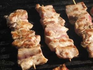 A húst kb. 3×3 cm-es kockákra vágom és nyársakra húzom. Sózom, borsozom, majd parázs felett szép pirosra sütöm.