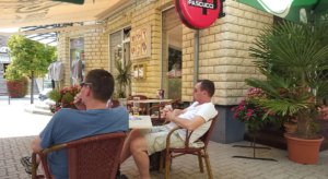 A terasz részen foglaltunk helyet és élveztük a gyönyörű időt. A többi asztalnál vegyesen ültek magyarok és külföldiek – a legérdekesebb egy holland meleg pár volt, ahol egyértelmű volt a “szereposztás”.